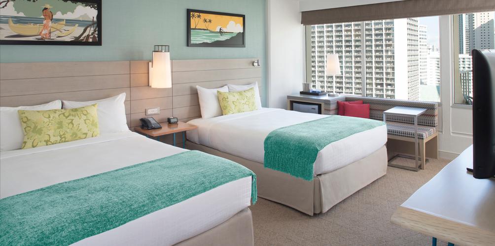 Spacious rooms include a 49-inch flat-screen TV and a refrigerator. Enjoy a brand new experience with property wide enhancements through our $35 million renovation. Queen Kapiolani Hotel, Oahu.